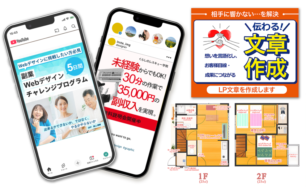 バナー、サムネイル、ヘッダー画像、地図画像などを制作します。Youtubeのサムネイルやインスタグラム投稿画像LINEリッチメニューなども制作できます。